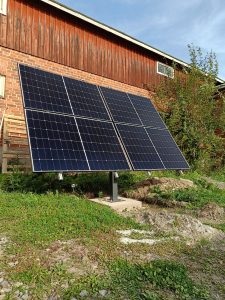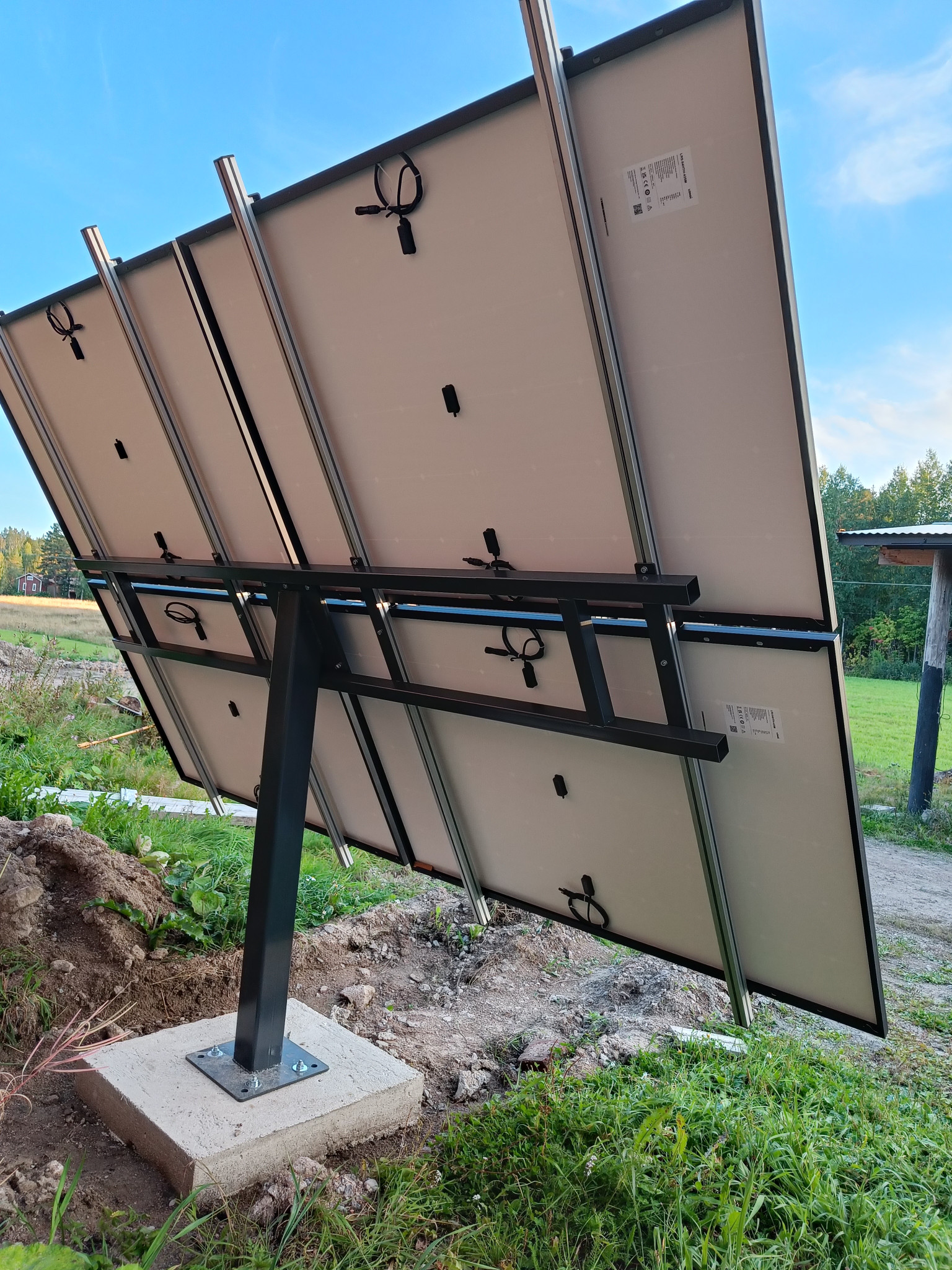 Tämä valmistamamme aurinkopaneelien maateline on hyvä vaihtoehto, jos asennus katolle ei ole vaihtoehto. Teline asennetaan jämäkkään alustaan ja se seisoo yhdellä jalalla. Tällöin sen ympäriltä on helppo niittää heinää ja pitää ympärys muutenkin siistinä. Asennuskulma on 58 astetta, jolloin teline ei vie paljoa tilaa pihamaalta. Lisäksi puhtaanapito on helppoa eikä lumi keräänny talvellakaan.